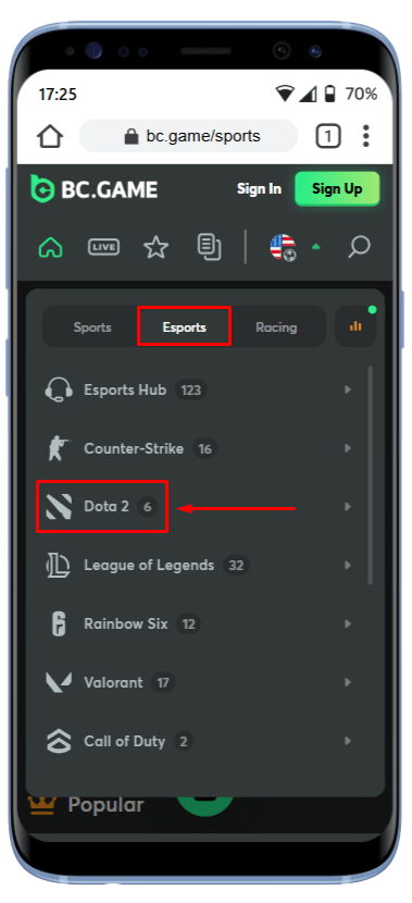 Head to the BC.Game sportsbook, click the esports tab, and select Dota 2 to check out matches and tournaments.