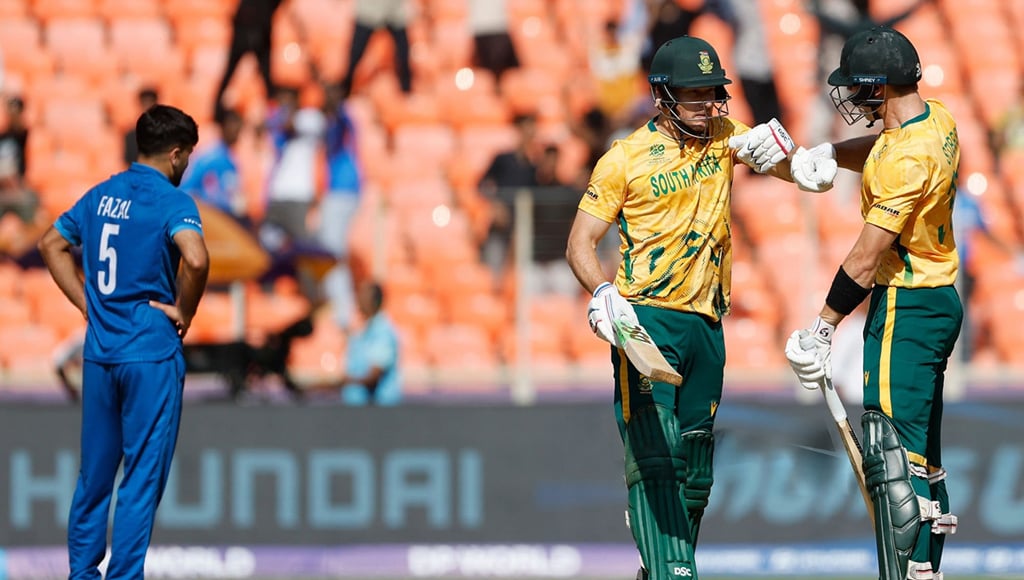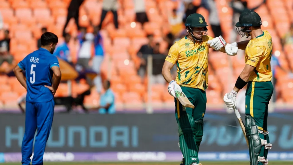কুইন্টন ডি কক ৪১ বলে ৫৯ রান করে আউট হন। এই ইনিংসের সাথে তিনি টি-টোয়েন্টি বিশ্বকাপে দক্ষিণ আফ্রিকার হয়ে সর্বোচ্চ রানের রেকর্ড গড়েন। তার মোট রান এখন ৭৩৬। রিকেলটন ৩৮ বলে ৬১ রান করেন। এরপর রশিদ খান এক ওভারে দুজনকেই ফিরিয়ে আফগানদের ম্যাচে ফেরান। রশিদ ৪ ওভারে ২৮ রান দিয়ে ২ উইকেট নেন। তার টি-টোয়েন্টি উইকেট এখন ৬৯৯। ৭০০ উইকেট থেকে তিনি মাত্র একটি দূরে। আজমতউল্লাহ ওমরজাইও গুরুত্বপূর্ণ সময়ে উইকেট নেন।