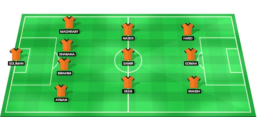 সোলিমান (জিকে), আয়মান (ডিএফ), ইব্রাহিম (ডিএফ), শাবানা (ডিএফ), মাগরাবী (ডিএফ), দীব (এমএফ), সামির (এমএফ), নাসের (এমএফ), ওয়াশ (এফডব্লিউ), গোমা (এফডব্লিউ), ফরিদ (এফডব্লিউ)।