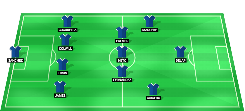 সানচেজ (জিকে), জেমস (ডিএফ), টোসিন (ডিএফ), কলউইল (ডিএফ), কুকুরেলা (ডিএফ), ক্যাসেডো (এমএফ), ফার্নান্দেজ (এমএফ), নেটো (এমএফ), পামার (এমএফ), মাদুকে (এমএফ), ডেলাপ (এফডাব্লু)