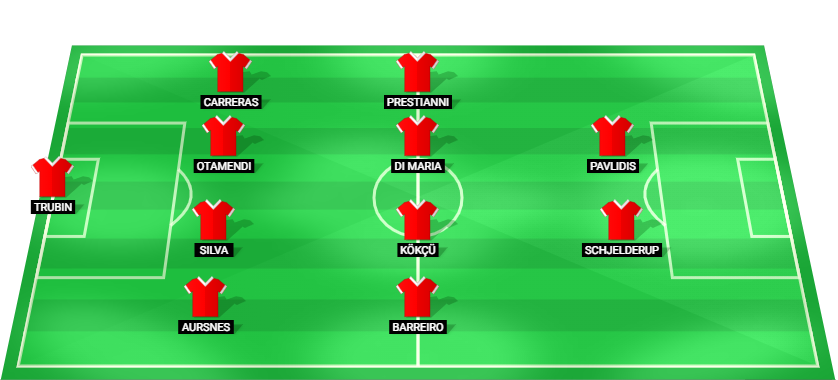 ট্রুবিন (জিকে), অরসনেস (ডিএফ), সিলভা (ডিএফ), ওটামেন্ডি (ডিএফ), ক্যারেরাস (ডিএফ), বারেইরো (এমএফ), কোক্কু (এমএফ), ডি মারিয়া (এমএফ), প্রেস্টিয়াননি (এমএফ), স্জেল্ডারুপ (এফডব্লিউ), পাভলিডিস (এফডাব্লু)