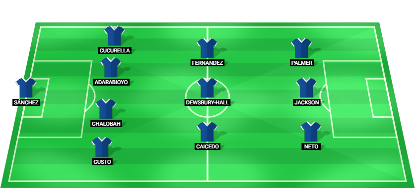 সানচেজ (জিকে), গুস্টো (ডিএফ), চালোবা (ডিএফ), আদারাবিয়ো (ডিএফ), কুকুরেলা (ডিএফ), ক্যাসেডো (এমএফ), ডেউসবারি-হল (এমএফ), ফার্নান্দেজ (এমএফ), নেটো (এফডব্লিউ), জ্যাকসন (এফডব্লিউ), পামার (এফডব্লিউ)