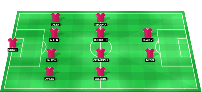 উস্তারি (জিকে), অ্যাভিলেস (ডিএফ), ফ্যালকন (ডিএফ), অ্যালেন (ডিএফ), আলবা (ডিএফ), অ্যালেন্ডে (এমএফ), ক্রেমাস্কি (এমএফ), বুসকেটস (এমএফ), সেগোভিয়া (এমএফ), মেসি (এফডব্লিউ), সুয়ারেজ (এফডব্লিউ)