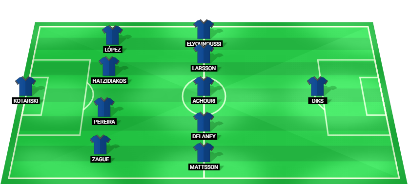 কোতার্সকি (গোলকিপার), জাগু (রক্ষণভাগ), পেরেইরা (রক্ষণভাগ), হাতজিদিয়াকোস (রক্ষণভাগ), লোপেজ (রক্ষণভাগ), ম্যাটসন (মধ্যমাঠ), ডেলানি (মধ্যমাঠ), আচুরি (মধ্যমাঠ), লারসন (মধ্যমাঠ), এলিউনুসি (মধ্যমাঠ), ডিকস (ফরোয়ার্ড)