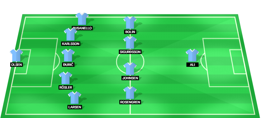 ওলসেন (গোলকিপার), লারসেন (রক্ষণভাগ), রসলার (রক্ষণভাগ), দুরিচ (রক্ষণভাগ), কার্লসন (রক্ষণভাগ), বুসানেল্লো (রক্ষণভাগ), রোসেনগ্রেন (মধ্যমাঠ), জনসেন (মধ্যমাঠ), সিগুরসন (মধ্যমাঠ), বলিন (মধ্যমাঠ), আলী (ফরোয়ার্ড)
