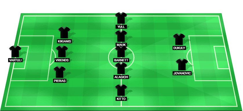 ভার্তুলি (জিকে), পিরিয়াস (ডিএফ), বন্ধু (ডিএফ), কিকিয়ানিস (ডিএফ), কিট্টো (এমএফ), আলাগিচ (এমএফ), বার্নেট (এমএফ), মাউক (এমএফ), ইউল (এমএফ), জোভানোভিক (এফডব্লিউ), দুকুলি (এফডব্লিউ)।