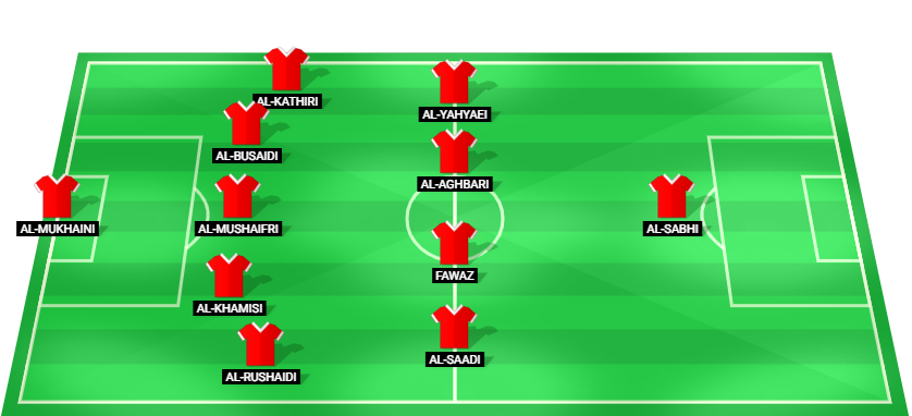 আল-মুখাইনি (জিকে), আল-রুশাইদি (ডিএফ), আল-খামিসি (ডিএফ), আল-মুশাইফ্রি (ডিএফ), আল-বুসাইদি (ডিএফ), আল-কাথিরি (ডিএফ), আল-সাদী (এমএফ), ফাওয়াজ (এমএফ), আল-আগবারি (এমএফ), আল-ইয়াহইয়াই (এমএফ), আল-আবলু (এমএফ)।