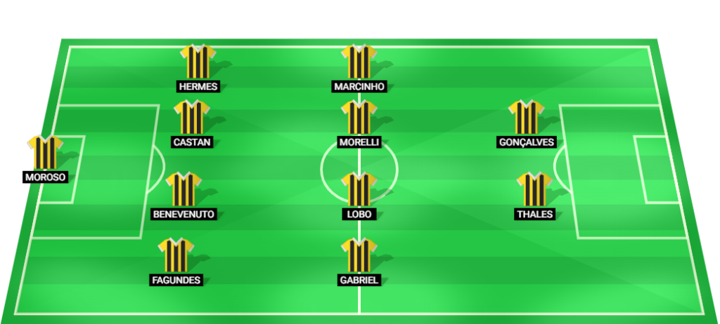 মোরোসো (জিকে), ফাগুন্ডেস (ডিএফ), বেনেভেনুটো (ডিএফ), কাস্তান (ডিএফ), হার্মিস (ডিএফ), গ্যাব্রিয়েল (এমএফ), লোবো (এমএফ), মোরেলি (এমএফ), মার্সিনহো (এমএফ), থ্যালেস (এফডব্লিউ), গনসালভেস (এফডব্লিউ)