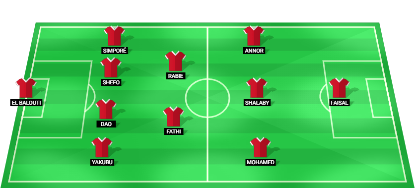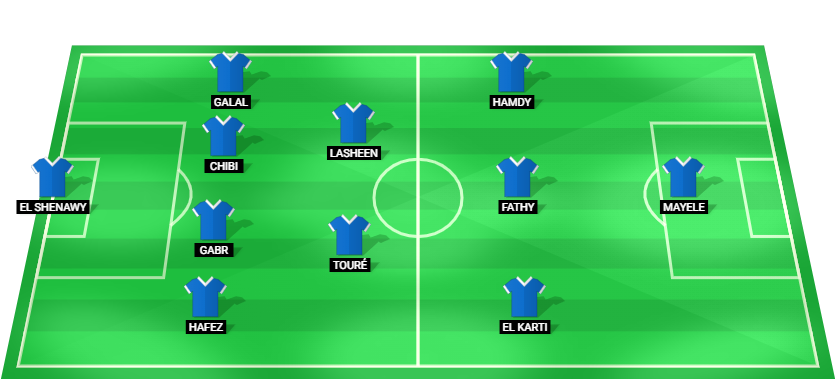 এল শেনাউই (জিকে), হাফেজ (ডিএফ), গাবর (ডিএফ), চিকি (ডিএফ), গালাল (ডিএফ), তুরে (এমএফ), লাশিন (এমএফ), এল কার্টি (এএম), ফাতি (এএম), হামদি (এএম), মায়েলে (এফডব্লিউ)।