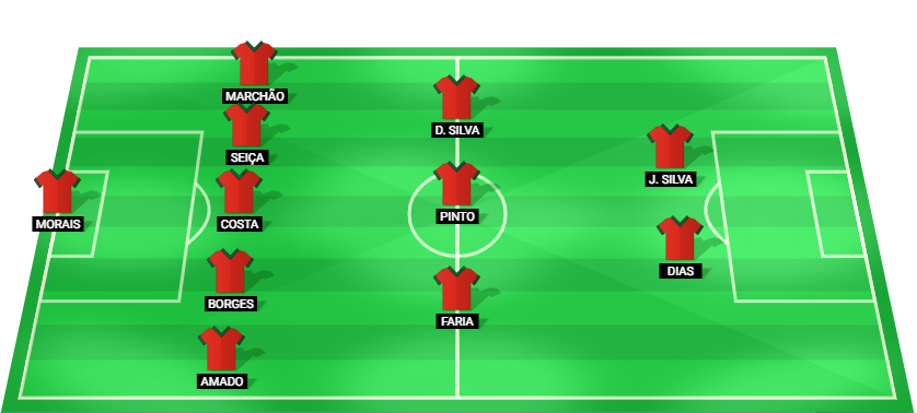 মোরাইস (জি কে), আমাদো (ডি এফ), বোর্গেস (ডি এফ), কস্তা (ডি এফ), সেইসা (ডি এফ), মারচাঁও (ডি এফ), ফারিয়া (এম এফ), পিন্টো (এম এফ), ডি. সিলভা (এম এফ), দিয়াস (এফ ডব্লিউ), জে. সিলভা (এফ ডব্লিউ)।