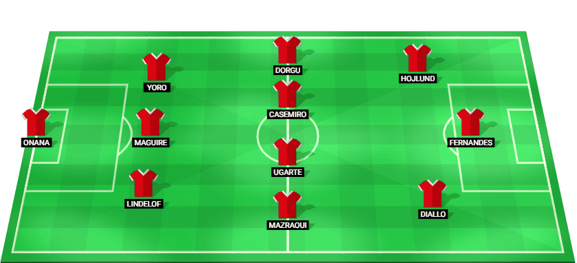 Onana (GK), Lindelof (DF), Maguire (DF), Yoro (DF), Mazraoui (MF), Ugarte (MF), Casemiro (MF), Dorgu (MF), Diallo (FW), ফার্নান্দেস (FW), Hojlund (FW)।
