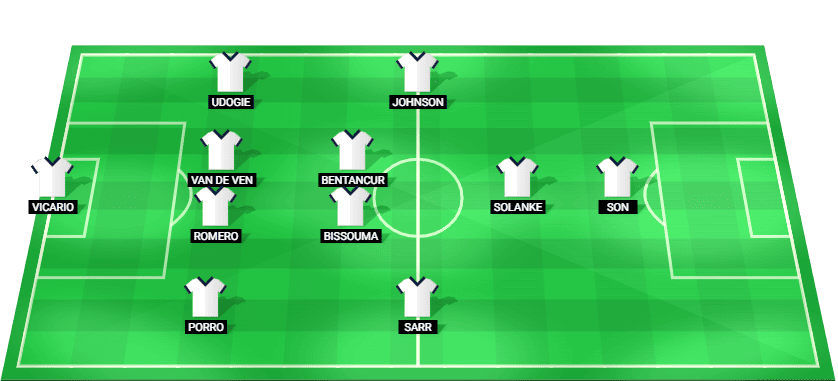 ভিকারিও (জিকে), পোরো (ডিএফ), রোমেরো (ডিএফ), ভ্যান ডি ভেন (ডিএফ), উদোগি (ডিএফ), সার (এমএফ), বিসুমা (এমএফ), বেন্টানকুর (এমএফ), জনসন (এমএফ), সোলাঙ্ক (এফডব্লিউ), সন (এফডব্লিউ)।