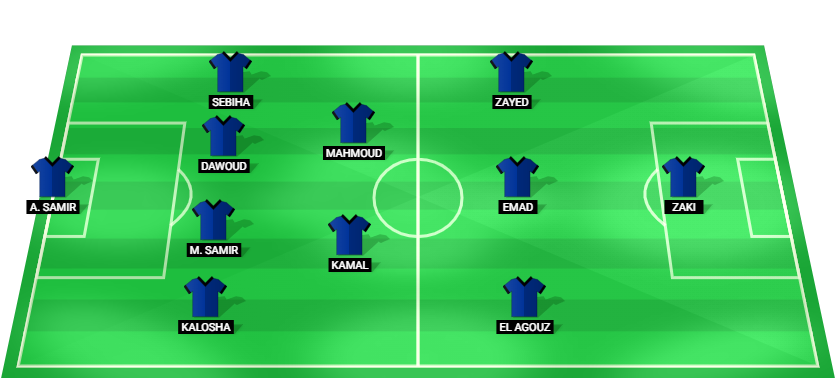A. Samir (GK), Kalosha (DF), M. Samir (DF), Dawoud (DF), Sebiha (DF), Kamal (MF), Mahmoud (MF), El Agouz (MF), Emad (MF), Zayed (MF), Zaki (FW).