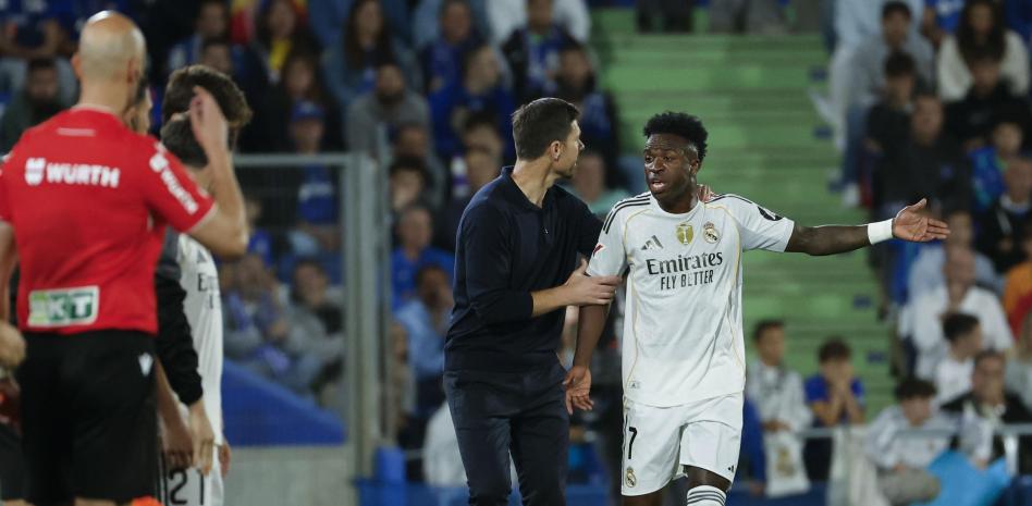 Tres minutos después de la roja a Nyom, llegó el gol del Madrid. El Getafe acabó con nueve por la segunda amarilla a Sancris (84’) y, al final, la indignación azulona se volcó en los micrófonos.