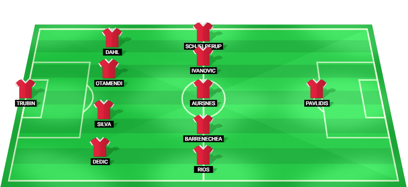 Trubin (GK), Dedic (DF), Silva (DF), Otamendi (DF), Dahl (DF), Rios (MF), Barrenechea (MF), Aursnes (MF), Ivanovic (MF), Schjelderup (MF), Pavlidis (FW)