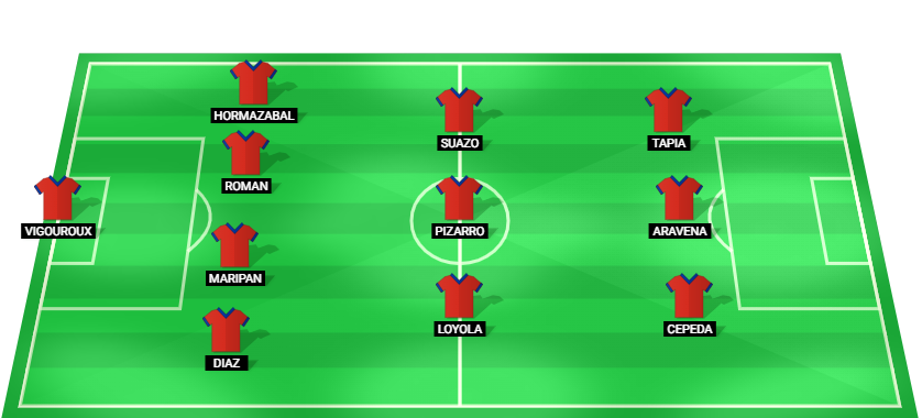 Vigouroux (GK), Diaz (DF), Maripan (DF), Roman (DF), Hormazabal (DF), Loyola (MF), Pizarro (MF), Suazo (MF), Cepeda (FW), Aravena (FW), Tapia (FW).