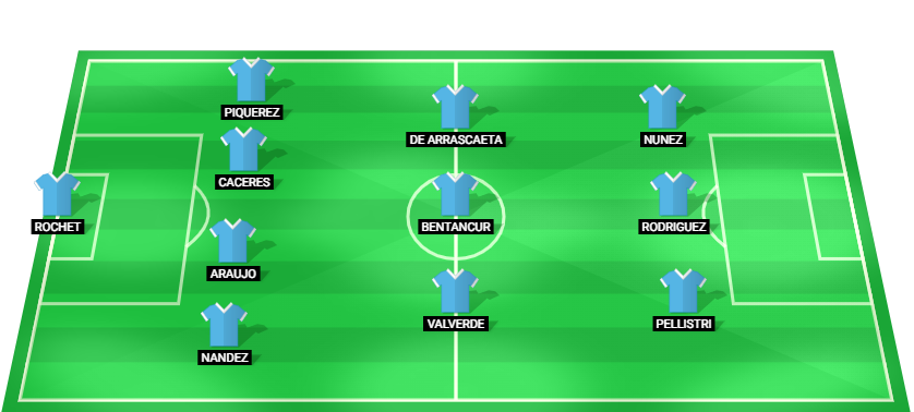 Rochet (GK), Nandez (DF), Araujo (DF), Caceres (DF), Piquerez (DF), Valverde (MF), Bentancur (MF), De Arrascaeta (MF), Pellistri (FW), Rodriguez (FW), Nunez (FW).