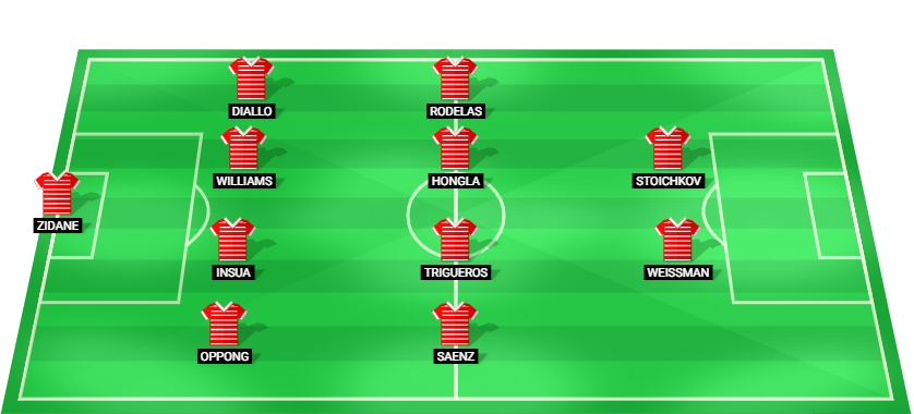 Zidane (GK), Oppong (DF), Insua (DF), Williams (DF), Diallo (DF), Saenz (MF), Trigueros (MF), Hongla (MF), Rodelas (MF), Weissman (FW), Stoichkov (FW)