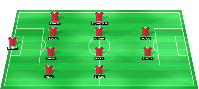 Dibusz (GK), Nego (DF), Orban (DF), Szalai (DF), Kerkez (DF), Styles (MF), Bolla (MF), A. Toth (MF), Szoboszlai (MF), B. Toth (FW), Varga (FW)