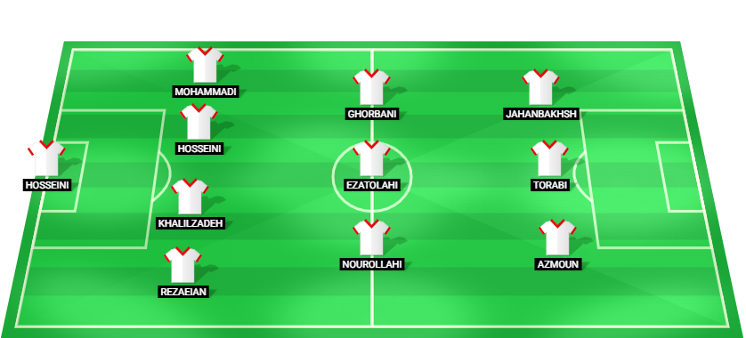 Hosseini (GK), Rezaeian (DF), Khalilzadeh (DF), Hosseini (DF), Mohammadi (DF), Nourollahi (MF), Ezatolahi (MF), Ghorbani (MF), Azmoun (FW), Torabi (FW), Jahanbakhsh (FW)