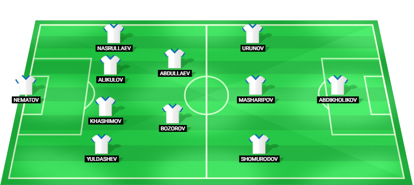 Nematov (GK), Yuldashev (DF), Khashimov (DF), Alikulov (DF), Nasrullaev (DF), Bozorov (MF), Abdullaev (MF), Shomurodov (MF), Masharipov (AMMF Urunov (MF), Abdikholikov (FW)