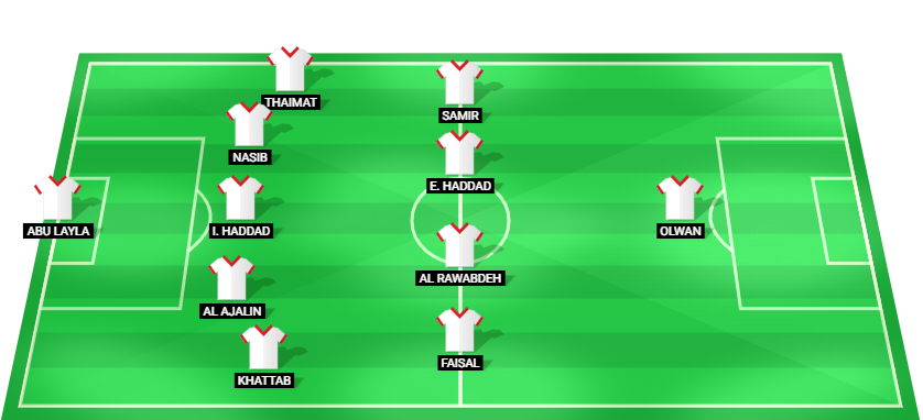 Abu Layla (GK), Khattab (DF), Al Ajalin (DF), I. Haddad (DF), Nasib (DF), Thaimat (DF), Faisal (MF), Al Rawabdeh (MF), E. Haddad (MF), Samir (MF), Olwan (FW).