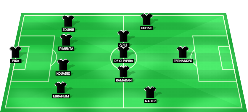 Eisa (GK), Ebraheim (DF), Kouadio (DF), Pimenta (DF), Zouhir (DF), Nader (MF), Ramadan (MF), De Oliveira (MF), Adill (MF), Suhail (MF), Fernandes (FW).