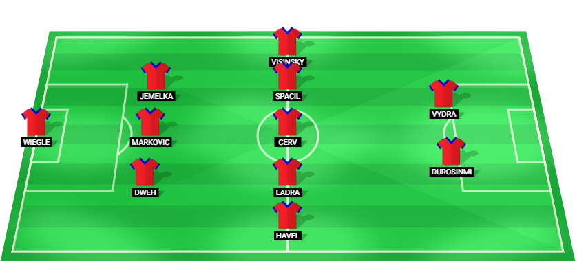 Wiegle (GK), Dweh (DF), Markovic (DF), Jemelka (DF), Havel (MF), Ladra (MF), Cerv (MF), Spacil (MF), Visinsky (MF), Durosinmi (FW), Vydra (FW)