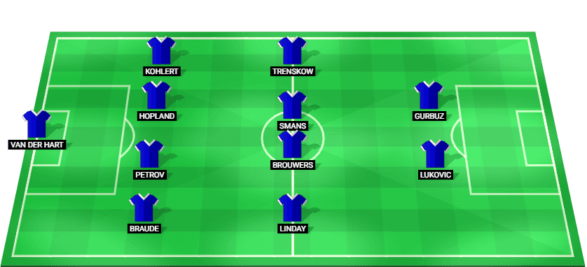 वैन डेर हार्ट (जीके), ब्रूड (डीएफ), पेट्रोव (डीएफ), होपलैंड (डीएफ), कोहलर्ट (डीएफ), लिंडे (एमएफ), ब्रूवर्स (एमएफ), स्मैंस (एमएफ), ट्रेंस्को (एमएफ), लुकोविक (एफडब्ल्यू), गुर्बुज़ (एफडब्ल्यू)।