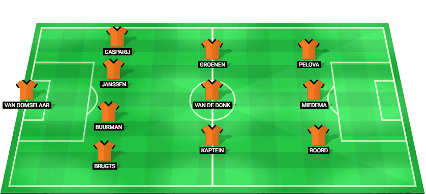 एंड्रीस जोंकर की अगुआई में नीदरलैंड्स 4-3-3 सेटअप के साथ उतर सकता है, जिसमें विवियन मीडेमा की अगुआई में उनकी आक्रामक क्षमता पर जोर दिया जाएगा। ऑरेंज के लिए संभावित शुरुआती XI इस प्रकार है: