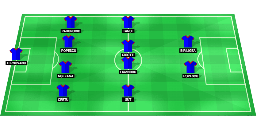 टेर्नोवानु (जीके), क्रेतु (डीएफ), नगेज़ाना (डीएफ), पोपेस्कु (डीएफ), रेडुनोविक (डीएफ), सुत (एमएफ), लिक्सेंड्रू (एमएफ), सिसोटी (एमएफ), तानसे (एमएफ), पोपेस्कु (एफडब्ल्यू), बिरिलिगिया (एफडब्ल्यू)।