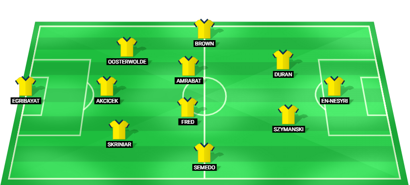 एग्रीबायत (जीके), स्क्रिनियार (डीएफ), अक्सिसेक (डीएफ), ओस्टरवॉल्ड (डीएफ), सेमेडो (एमएफ), फ्रेड (एमएफ), अमराबाट (एमएफ), ब्राउन (एमएफ), स्ज़िमांस्की (एएम), डुरान (एएम), एन नेसिरी (एफडब्ल्यू)
