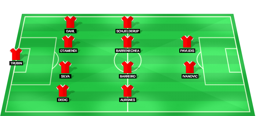 ट्रुबिन (जीके), डेडिक (डीएफ), सिल्वा (डीएफ), ओटामेंडी (डीएफ), डाहल (डीएफ), और्सनेस (एमएफ), बैरेइरो (एमएफ), बैरेनेचिया (एमएफ), शेजेल्डरुप (एमएफ), इवानोविक (एफडब्ल्यू), पावलिडिस (एफडब्ल्यू)