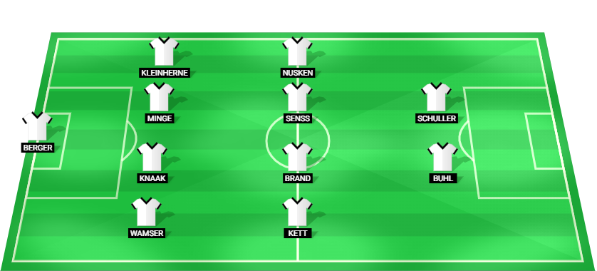 बर्जर (जीके), वामसर (डीएफ), नैक (डीएफ), मिंज (डीएफ), क्लेनहर्न (डीएफ), केट (एमएफ), ब्रांड (एमएफ), सेंस (एमएफ), नुस्केन (एमएफ), बुहल (एफडब्ल्यू), शूलर (एफडब्ल्यू)
