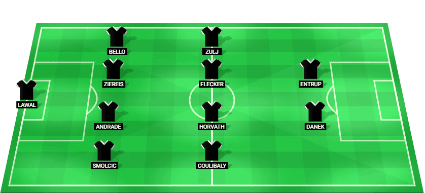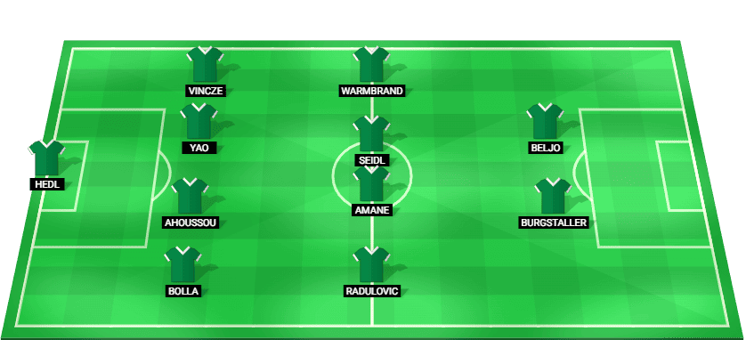 हेडल (जीके), बोल्ला (डीएफ), अहौसौ (डीएफ), याओ (डीएफ), विंज़े (डीएफ), रेडुलोविक (एमएफ), अमाने (एमएफ), सीडल (एमएफ), वार्मब्रांड (एमएफ), बर्गस्टालर (एफडब्ल्यू), बेल्जो (एफडब्ल्यू)।