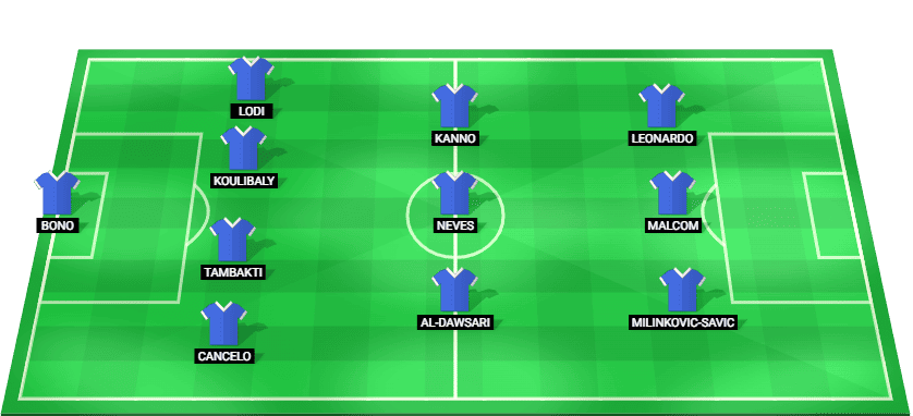 बोनो (जीके), कैंसेलो (डीएफ), ताम्बक्ति (डीएफ), कोउलीबाली (डीएफ), लोदी (डीएफ), एन. अल-दावसारी (एमएफ), नेवेस (एमएफ), कन्नो (एमएफ), मिलिनकोविक-सैविक (एफडब्ल्यू), मैल्कम (एफडब्ल्यू), लियोनार्डो (एफडब्ल्यू)।