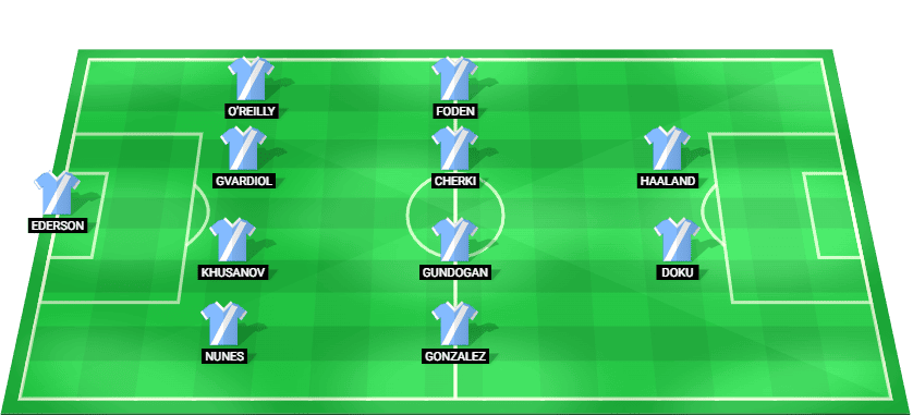एडर्सन (जीके), नून्स (डीएफ), खुसानोव (डीएफ), ग्वारडिओल (डीएफ), ओ’रेली (डीएफ), गोंजालेज (एमएफ), गुंडोगन (एमएफ), चेर्की (एमएफ), फोडेन (एमएफ), डोकू (एफडब्ल्यू), हैलैंड (एफडब्ल्यू)।