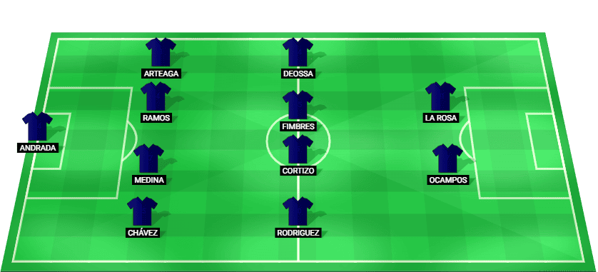 एंड्राडा (जीके), चावेज़ (डीएफ), मदीना (डीएफ), रामोस (डीएफ), आर्टेगा (डीएफ), रोड्रिग्ज (एमएफ), कॉर्टिज़ो (एमएफ), फिम्ब्रेस (एमएफ), डेओसा (एमएफ), ओकाम्पोस (एफडब्ल्यू), डे ला रोजा (एफडब्ल्यू)