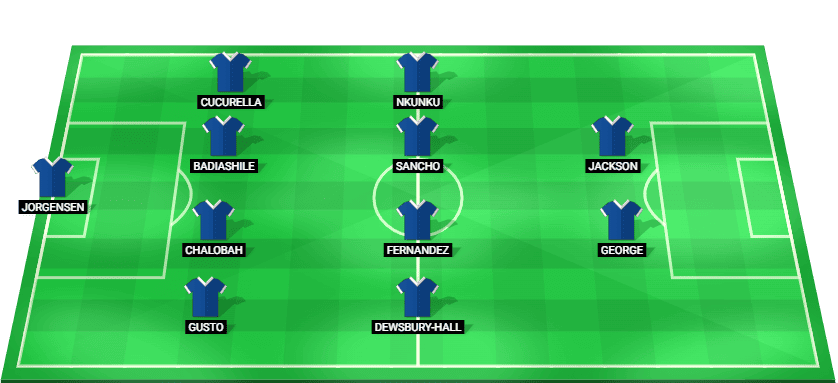 जोर्गेनसेन (जीके), गुस्टो (डीएफ), चालोबा (डीएफ), बडियाशिले (डीएफ), कुकुरेला (डीएफ), ड्यूसबरी-हॉल (एमएफ), फर्नांडीज (एमएफ), सांचो (एमएफ), नकुंकू (एमएफ), जॉर्ज (एफडब्ल्यू), जैक्सन (एफडब्ल्यू)