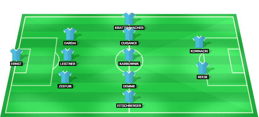 अर्न्स्ट (जीके), ज़ीफुइक (डीएफ), लीस्टनर (डीएफ), डारदाई (डीएफ), ईट्सचबर्गर (एमएफ), डेमे (एमएफ), कार्बोनिक (एमएफ), कुइसेंस (एमएफ), क्रैटनमाकर (एमएफ), रीज़ (एफडब्ल्यू), कोनाकी (एफडब्ल्यू)