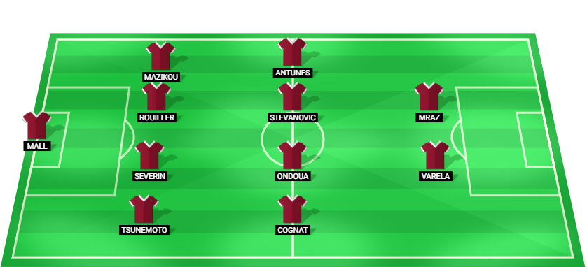 मॉल (जीके), त्सुनेमोटो (डीएफ), सेवेरिन (डीएफ), रूइलर (डीएफ), माज़िकौ (डीएफ), कॉग्नाट (एमएफ), ओन्डौआ (एमएफ), स्टवानोविक (एमएफ), एंट्यून्स (एमएफ), वेरेला (एफडब्ल्यू), मेराज (एफडब्ल्यू)।