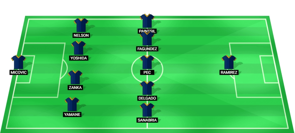 मिकोविक (जीके), यामाने (डीएफ), ज़ंका (डीएफ), योशिदा (डीएफ), नेल्सन (डीएफ), सनाब्रिया (एमएफ), डेलगाडो (एमएफ), पेक (एमएफ), फगुंडेज़ (एमएफ), पेंटसिल (एमएफ), रामिरेज़ (एफडब्ल्यू)।