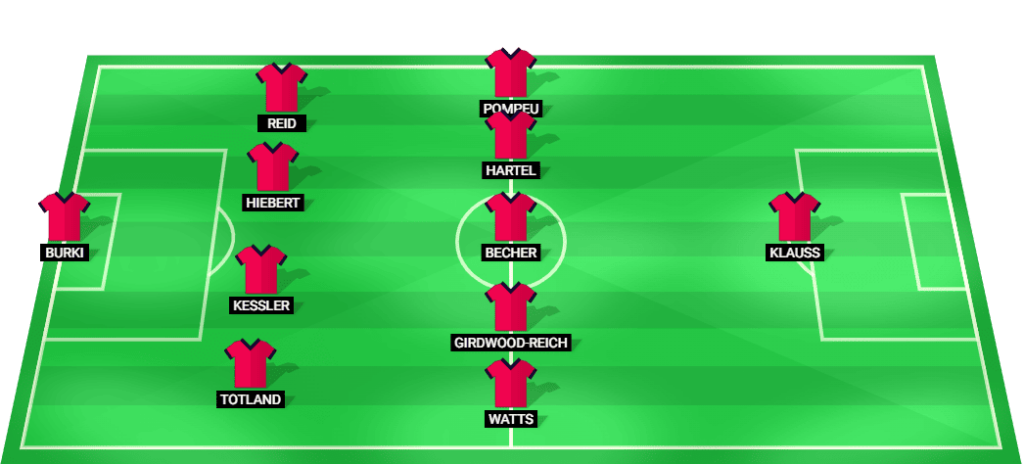 बुर्की (जीके), टोटलैंड (डीएफ), केसलर (डीएफ), हाइबर्ट (डीएफ), रीड (डीएफ), वाट्स (एमएफ), गर्डवुड-रीच (एमएफ), बेचर (एमएफ), हार्टेल (एमएफ), पोम्पेउ (एमएफ), क्लॉस (एफडब्ल्यू)।