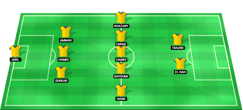 एडेल (जीके), सुक्कर (डीएफ), हमदी (डीएफ), अम्मार (डीएफ), नस्र (एमएफ), बयूमी (एमएफ), हमदी (एमएफ), फराग (एमएफ), खतरी (एमएफ), एल दाह (एफडब्ल्यू), ट्रैओर (एफडब्ल्यू)।