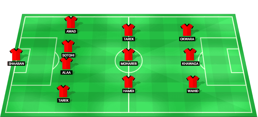 शाबान (जीके), तारेक (डीएफ), अला (डीएफ), सोतोही (डीएफ), अवद (डीएफ), हम्दी (एमएफ), मोहरेब (एमएफ), तारेक (एमएफ), वाहिद (एफडब्ल्यू), खवागा (एफडब्ल्यू), ओकवारा (एफडब्ल्यू)।
