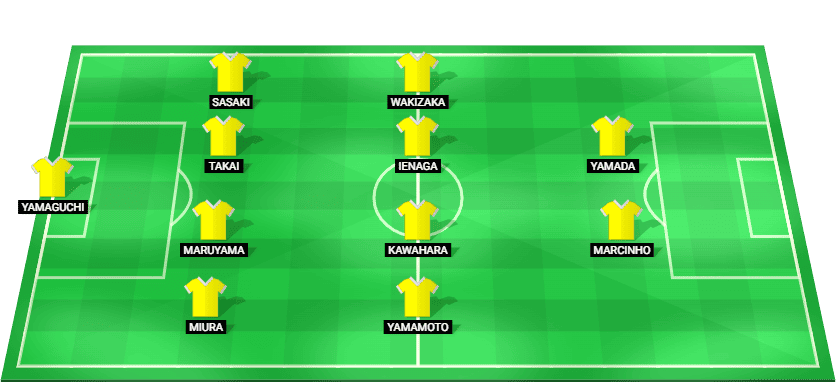 यामागुची (जीके), मिउरा (डीएफ), मारुयामा (डीएफ), ताकाई (डीएफ), सासाकी (डीएफ), यामामोटो (एमएफ), कवाहरा (एमएफ), इनागा (एमएफ), वाकिजाका (एमएफ), मार्सिन्हो (एफडब्ल्यू), यमादा (एफडब्ल्यू)।