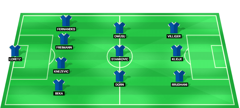 लोरेट्ज़ (जीके), बेका (डीएफ), कनेजेविक (डीएफ), फ्रीमैन (डीएफ), फर्नांडिस (डीएफ), डोर्न (एमएफ), स्टैंकोविक (एमएफ), ओवसु (एमएफ), रुधानी (एफडब्ल्यू), क्लिडजे (एफडब्ल्यू), विलिगर (एफडब्ल्यू)।