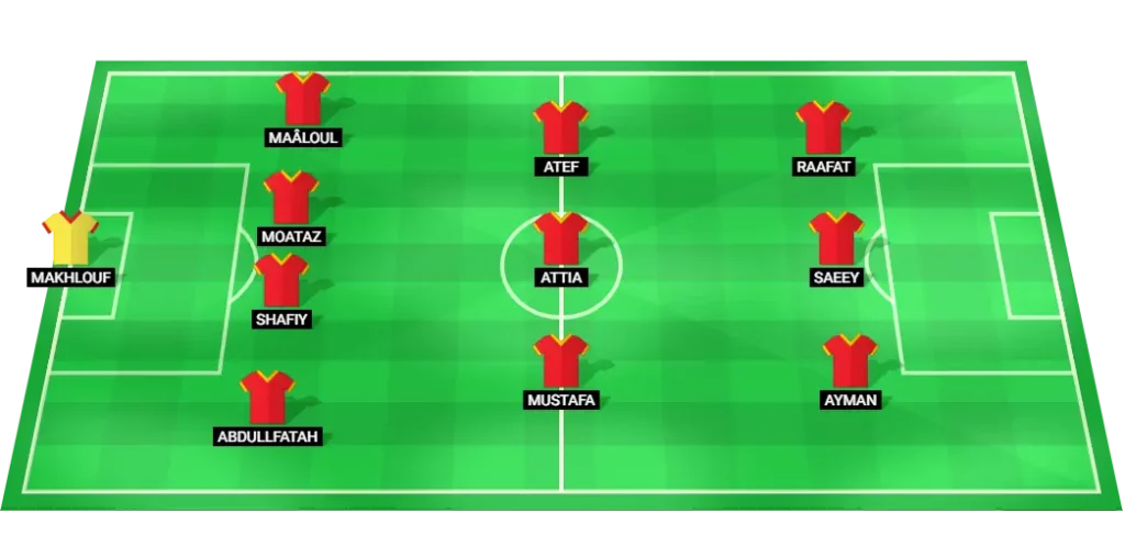 Al Ahly Predicted Lineup: Makhlouf (GK), Abdullfatah (DF), Shafiy (DF), Moataz (DF), Maâloul (DF), Mustafa (MF), Attia (MF), Atef (MF), Ayman (FW), Saeey (FW), Raafat (FW)