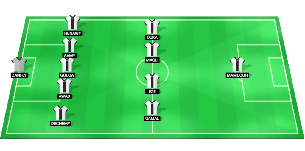 Haras El Hodoud Predicted Lineup: Zanfly (GK), Deghemy (DF), Awad (DF), Gouda (DF), Samy (DF), Henawy (DF), Gamal (MF), Eze (MF), Magli (MF), Ouka (MF), Mamdouh (FW)