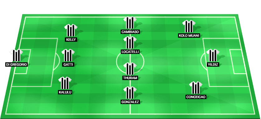 Di Gregorio (GK), Kalulu (DF), Gatti (DF), Kelly (DF), Gonzalez (DF), Thuram (MF), Locatelli (MF), Cambiaso (MF), Conceicao (MF), Yildiz (FW), Kolo Muani (FW).